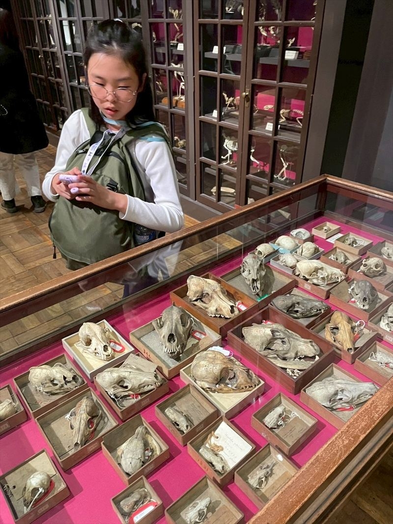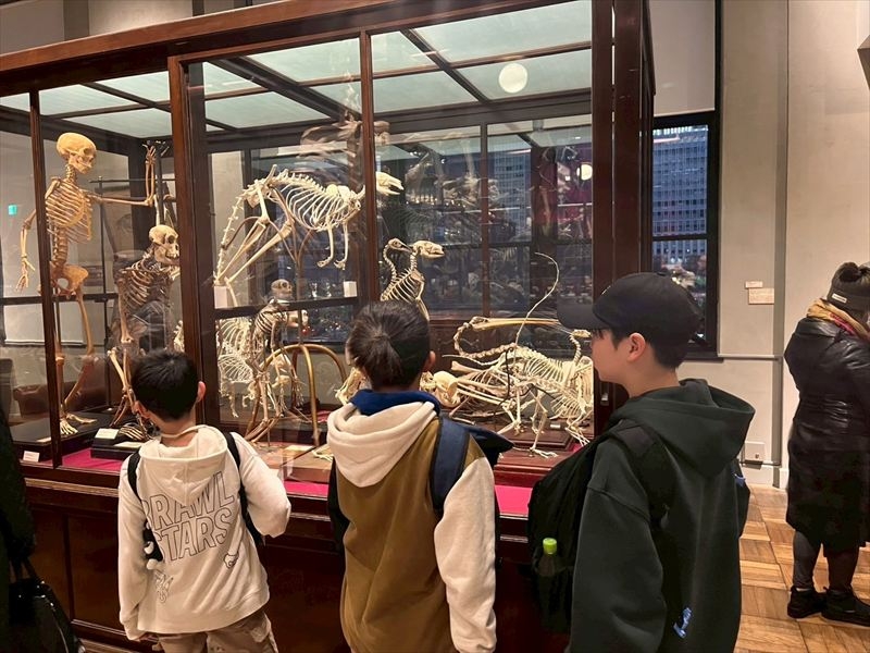 ガラスケースの中に並ぶ多くの骸骨は、思わず足を止めてしまうほどの迫力で、子どもたちは「えっ!?」と声を上げて驚いていました。