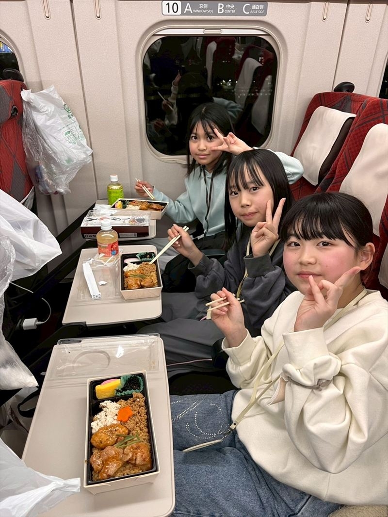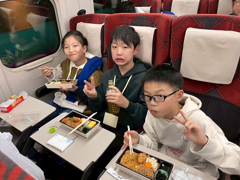 6:41発の新幹線に乗り込み、車内ではみんな元気いっぱいに朝ごはん。